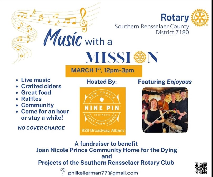 On Sunday, March 1st, a benefit for our club and the Joan Nicole Prince Home for the Dying will be held at Nine Pin Cider on Broadway in Albany’s warehouse district. Scheduled from noon to 3 p.m., Mario Seveyaga and Enjoyous will perform. Raffles and silent auctions will be held. The venue has donated the space. There will be no entry fee. Members are asked to focus on secure items for a silent auction, such as baskets, business services, products, etc. More details to follow.