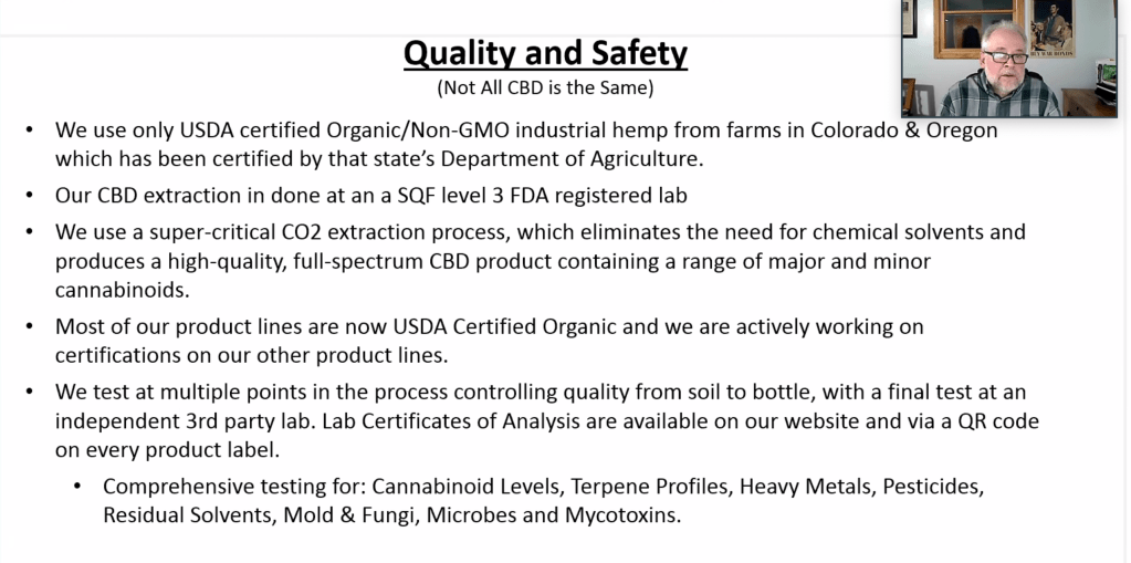 Tony explained that cannabidiol, popularly called CBD, sold as part of his company’s product line is obtained from industrial hemp, a cousin of the marijuana plant that does not contain halucinogenics. It has been a legal substance nationwide since passage of the federal 2018 Farm Bill. He said it works through the cannabinoids signaling system present in mammalian bodies, with CBD products supplementing natural cannabinoids. Products are formulated for both humans and pets.