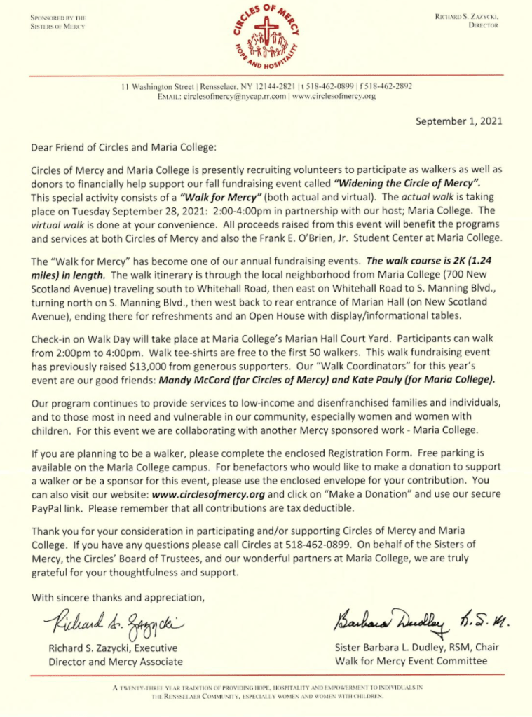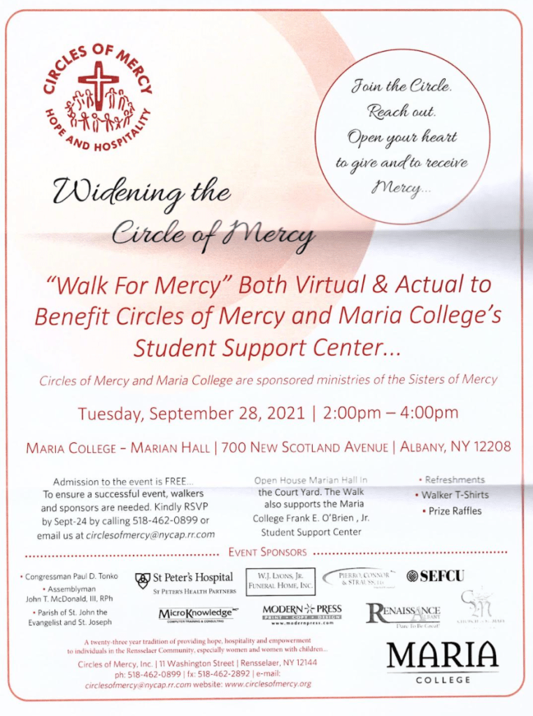 Our friends at Circles of Mercy are teaming up with students and staff at Maria College for a “Walk for Mercy” and they are inviting you to join them as volunteer walkers.
