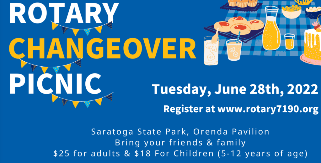 That event is the transition of the District 7190 leadership team for the new Rotary Year 2022-23. The family-friendly event is scheduled for the Orenda Pavilion at Saratoga Spa State Park. Here are the details:
