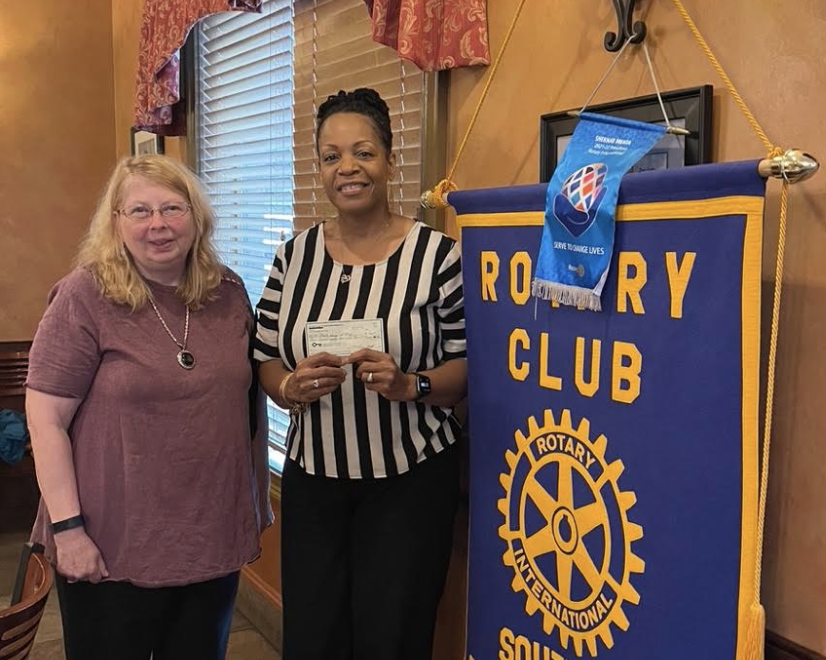 Debbie presented Scharlette with a check from the club for $382. The money was collected via the “Pocket Change” contribution jug that is passed around at in-person SRC meetings. That method of fundraising for a different, specific purpose each Rotary Year as designated by the current president was instituted in 2013 under then-President April Dowd.