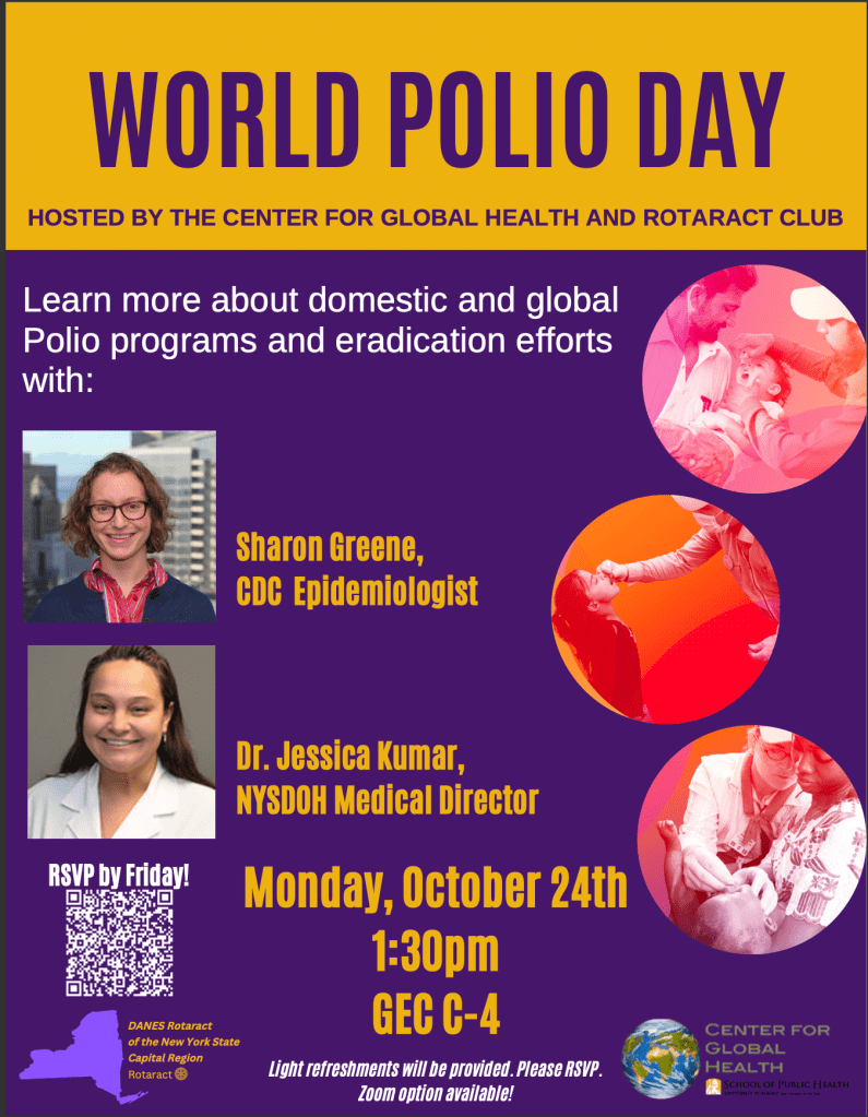 Uncategorized World Polio Day Event co-hosted by The Danes Rotaract Club and The Center for Global Health October 18, 2022October 20, 2022 SRCrotaryLeave a comment All Southern Rensselaer County Rotary members have been invited by the Danes Rotaract Club to attend their World Polio Day Event. They ask that if you plan on attending to please use the link below so that they have an accurate count. https://www.surveymonkey.com/r/7W8BGMC Share this: Click to share on X (Opens in new window) X Click to share on Facebook (Opens in new window) Facebook Like Loading... Related