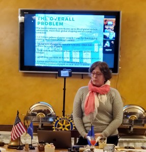 Line Hendriksen spoke about Apparel Impact which is a textile recycler. The Company was founded in 2014 and is New England based. They have 830 partners that allow Apparel Impact to place recycling bins on their property. The bins are emptied once or twice a week. At the warehouse, the clothing is placed in large sacks that hold 350 to 400 pounds each. The clothing is not sorted. When they have collected 40,000 pounds of textiles, the sacks are picked up and are sold to wholesale brokers. The sacks end up in sorting centers are then shipped to Central and South America, Africa and Mexico. Apparel Impact has recovered 6.5 million pounds of textiles. Over 700,000 tons of used clothing is sent to other countries annually. The economies in these countries are positively impacted through the creation of markets and jobs. 87% are women owned businesses.