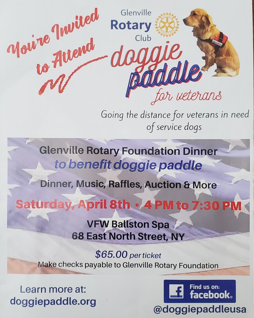 Many veterans suffer from traumatic brain injury, PTSD or amputations. They have a 50% higher risk of suicide. More than 114,000 veterans have died by suicide since 2001. Veterans are in need of service dogs. The military does not provide nor does insurance cover the cost for service dogs. Trained service dogs can cost anywhere from $10,000 to $75,000. Jimmy and the Glenville Rotary Club established Doggie Paddle in order to help veterans obtain a service dog.
