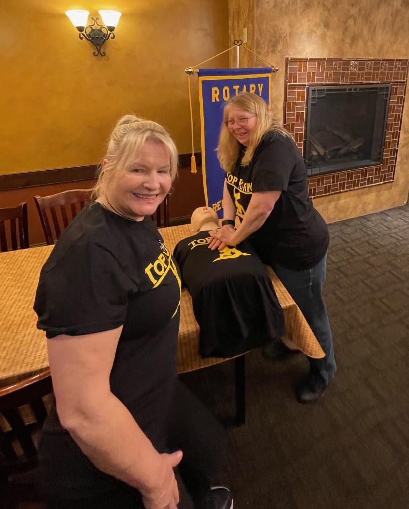 Ron and Monica provided a cardiopulmonary resuscitation (CPR) refresher to fellow Rotarians. The first thing you do is gently shake the person and ask if he/she is OK. If there is no response, ask someone to call 911 and get the AED (automatic external defibrillator). Next, check to see if the person is breathing, moving or making any noises. If not, start chest compressions. Compressions should be an inch to two inches and compress to the song “Staying Alive” for the rate of compressions.