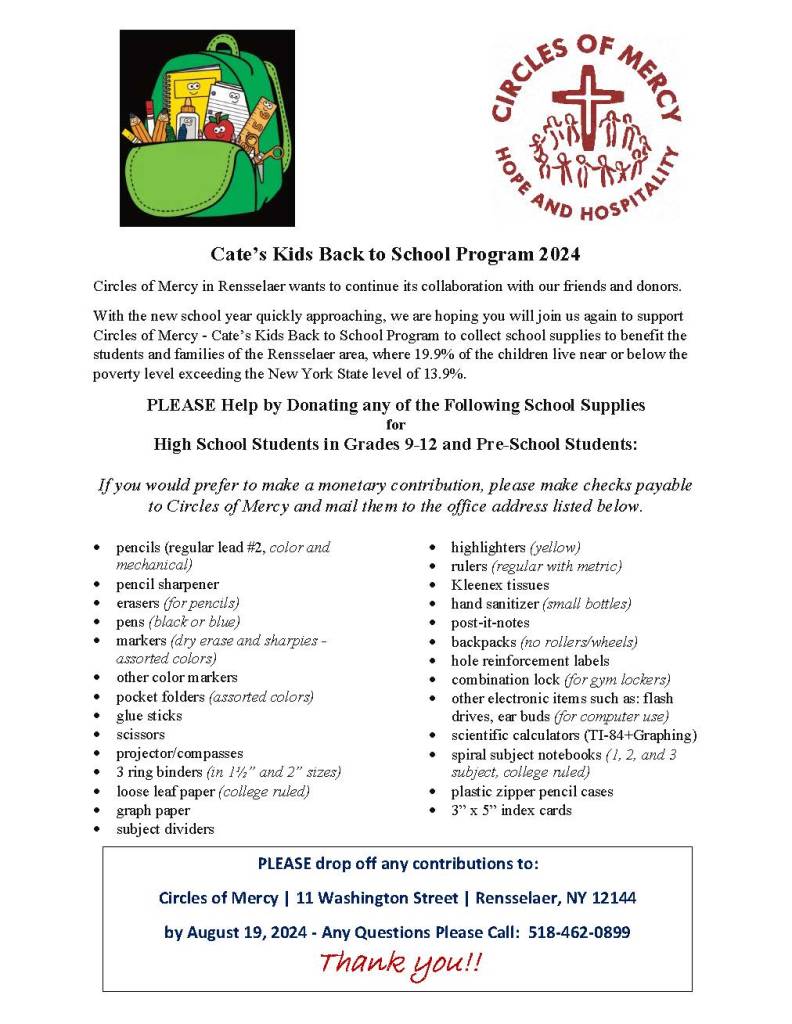 Please don’t forget the Circles of Mercy Back to School Program. This is an annual event and collections end on August 18th. Carole Heaney is collecting at our events so that you don’t need to deliver to Circles of Mercy in person. The list is below.