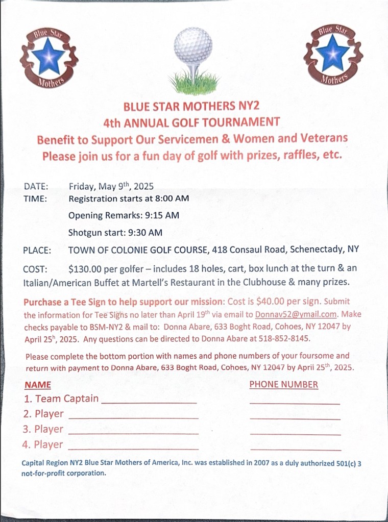 Blue Star Mothers 4th Annual Golf Tournament: Please see the flyer posted at the bottom of the page.